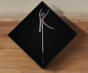 Het lijf van de figuur in de speld vormt de letter K, het hoofd is los van het lijf. Een expressief, theatraal mens in beweging. Hoofd en lijf maken los van elkaar een groei door en verkennen elk hun eigen grenzen en groeien samen naar een vorm van expressie van één persoon.